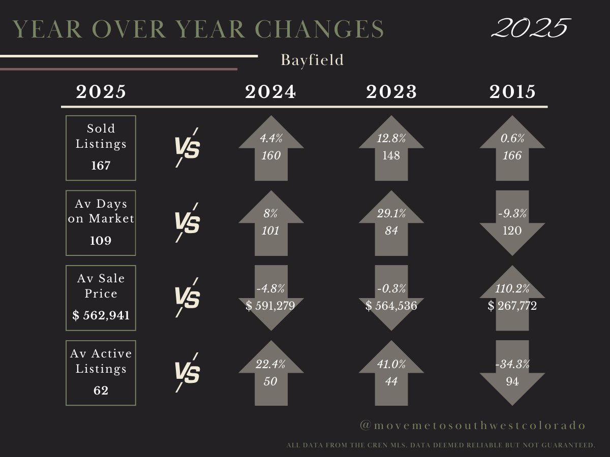 Bayfield mirrored the Pagosa trend. A price correction of 4.8% (bringing the average to ~$563,000) sparked a 4.4% increase in sales volume. Bayfield solidified its role as the "smart buy" for those priced out of Durango, offering significant value for money.
