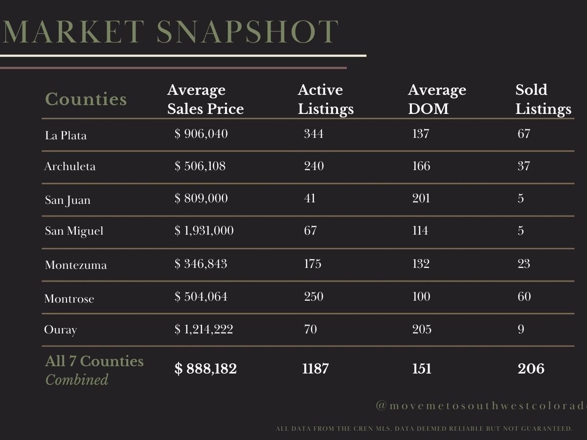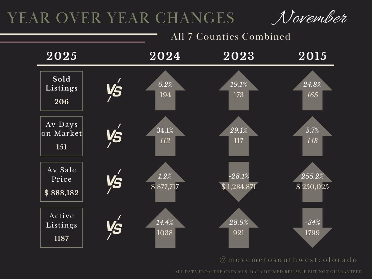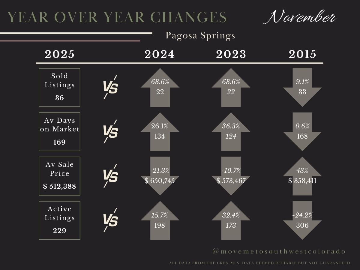 November confirms that the Southwest Colorado market is active but discerning. The "growth at all costs" era is over, replaced by a value-driven market. Buyers are willing to transact, but only when the price makes sense. As we head into the holidays, the most successful sellers will be the ones who take a cue from the Pagosa Springs data and price aggressively to capture attention.